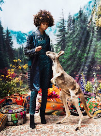 hasta un caimán que posan junto a modelos con vestidos coloridos que